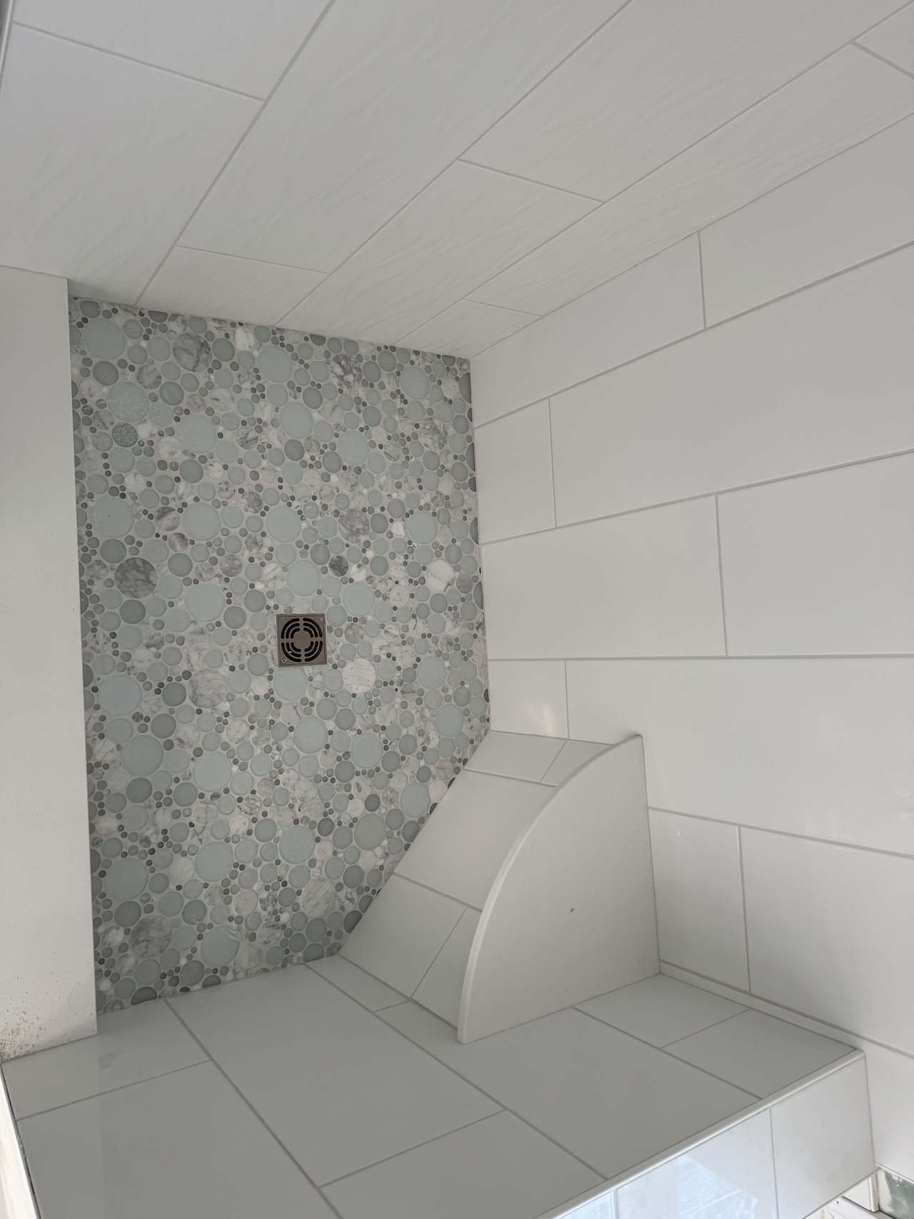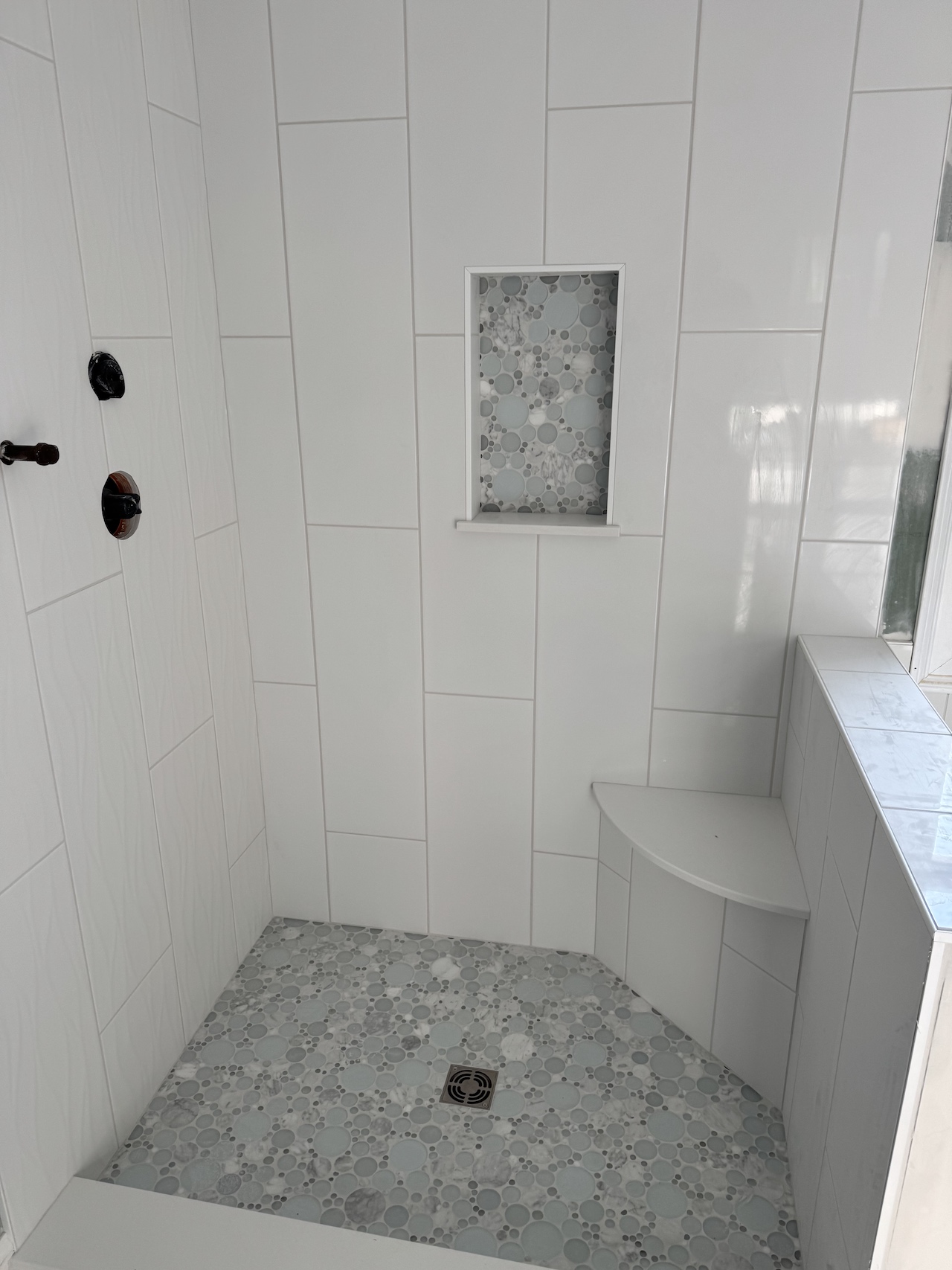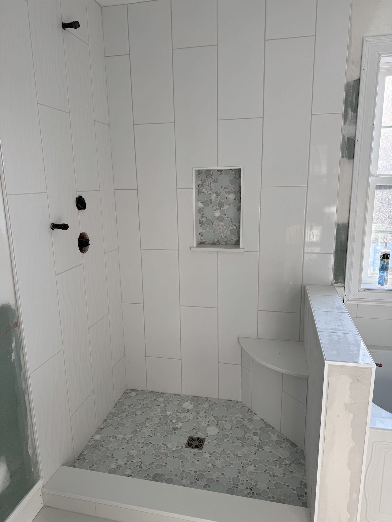 This custom bathroom tile installation in Dartmouth, MA, was completed in partnership with a local general contractor as part of a full remodel on John Alden Court. The project featured a custom-tiled shower with thoughtful design elements, including a built-in bench, recessed shelf, half wall, and a detailed inlay that added texture and elegance to the space.