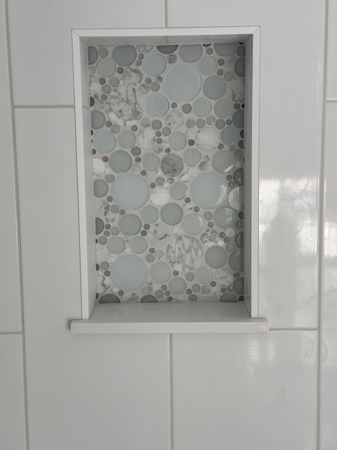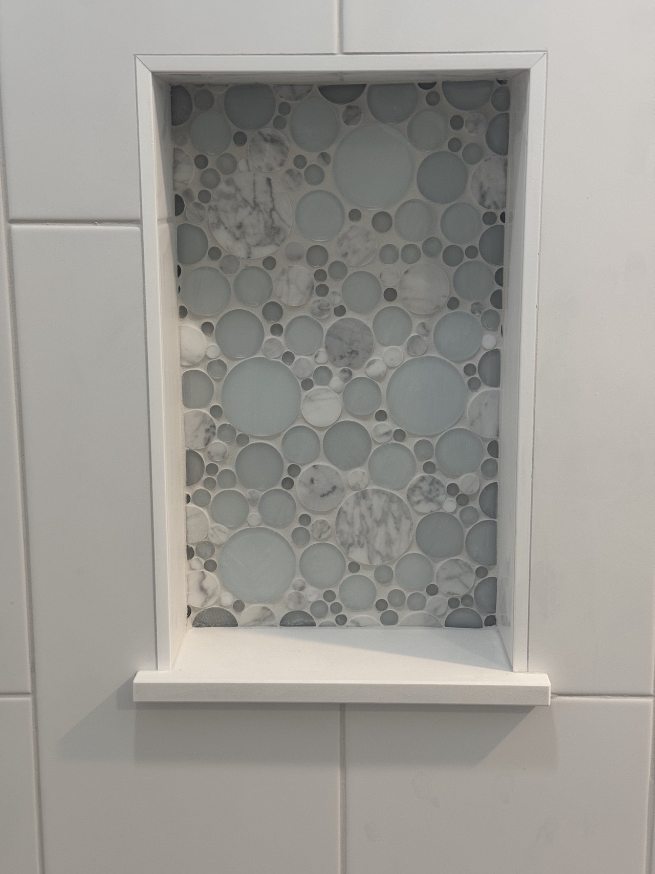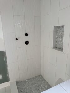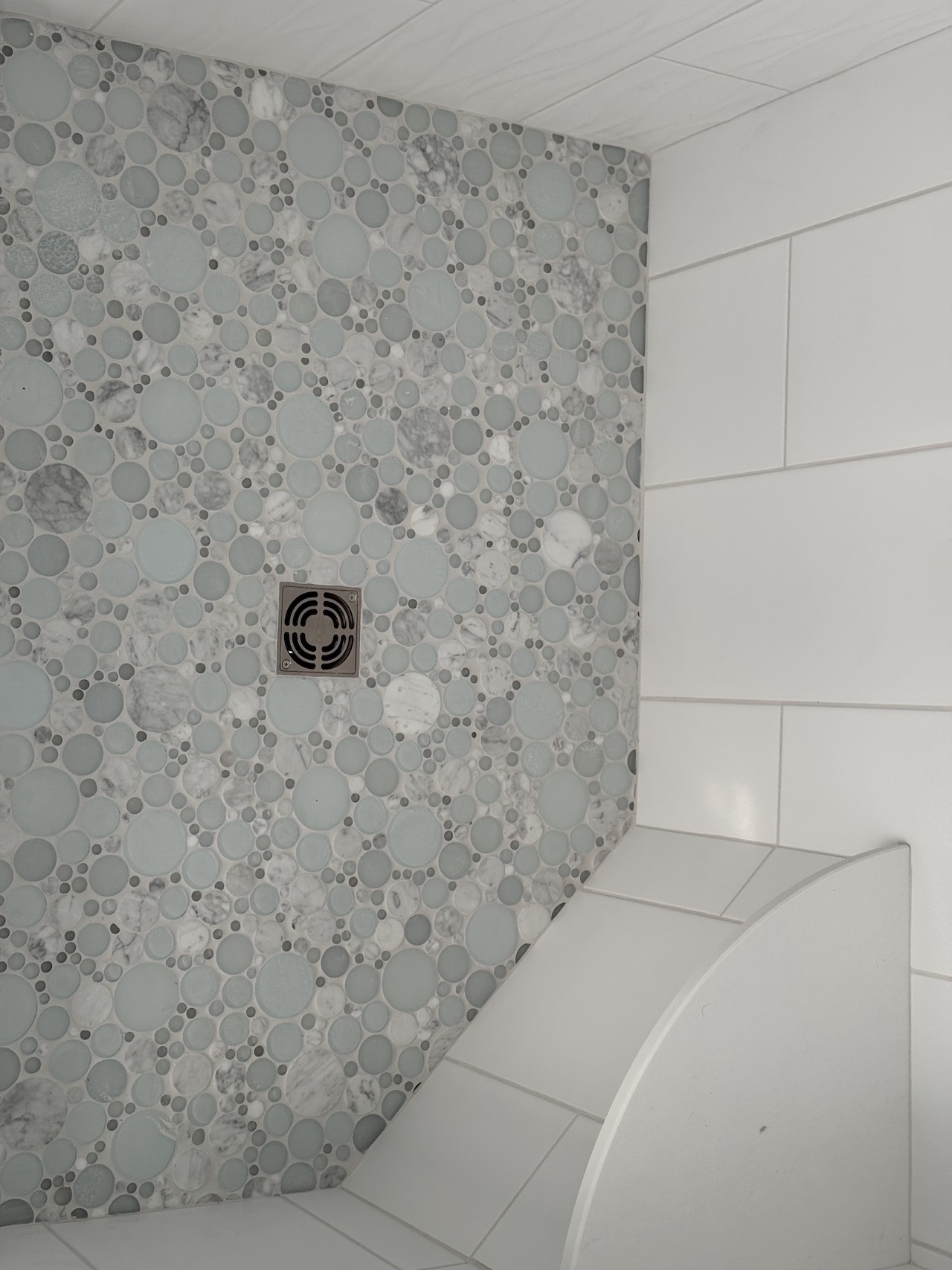 This custom bathroom tile installation in Dartmouth, MA, was completed in partnership with a local general contractor as part of a full remodel on John Alden Court. The project featured a custom-tiled shower with thoughtful design elements, including a built-in bench, recessed shelf, half wall, and a detailed inlay that added texture and elegance to the space.
